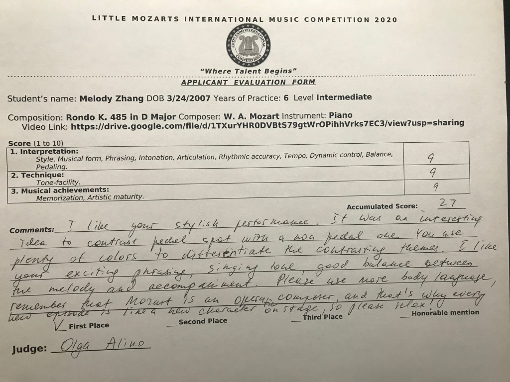Because it was online this year, there weren’t any opportunities for concerts at Carnegie Hall- but nevertheless, I’m proud of my first place win.