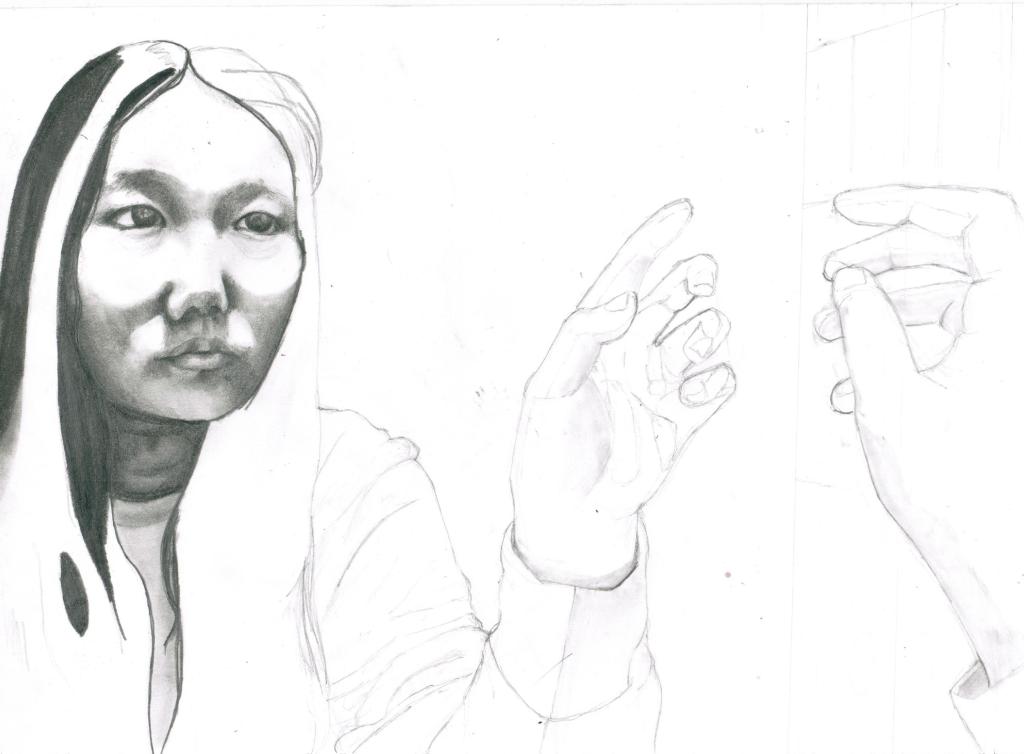 Below is my second progress image, with one hand shaded in, the face, the hair, and the clothing!