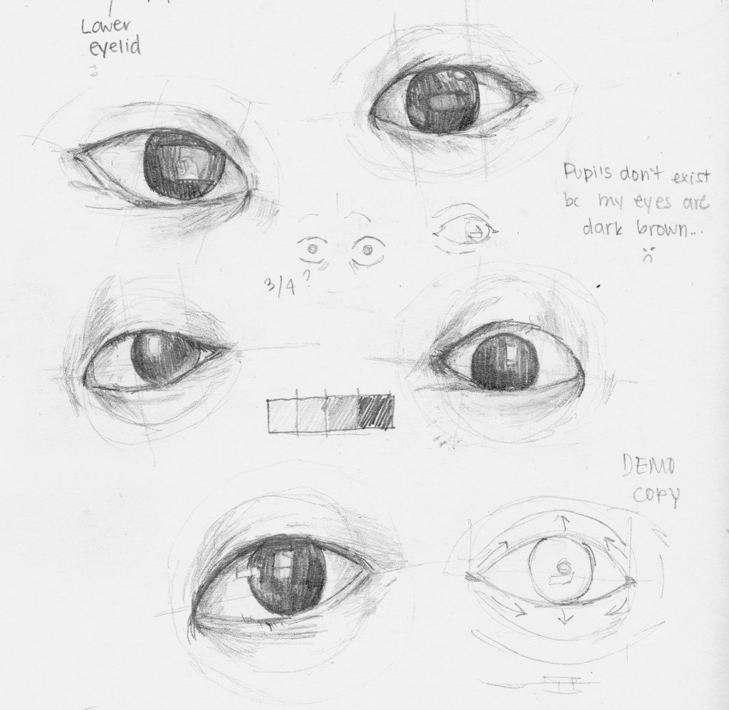 Shortly after our facial features assignment, we started thinking about our portraits. I didn’t want to do any typical portrait, because I felt like that would be giving myself an easy way out (and probably a way too easy A), so I tried to think up some things. I debated on going outside in the early morning to get a reference photo with fancy lighting, but unfortunately the sun decided to stay in the clouds that day (despite Google having claimed the morning to be perfectly sunny and clear). But I kept thinking about lighting and perspective, and eventually I had looked at my own mirror and gone “huh….”—