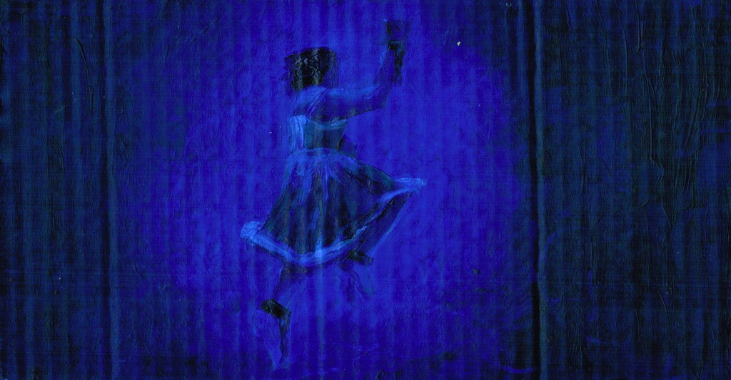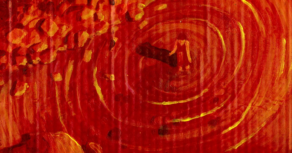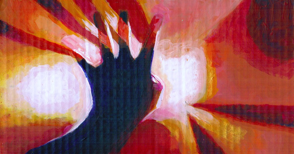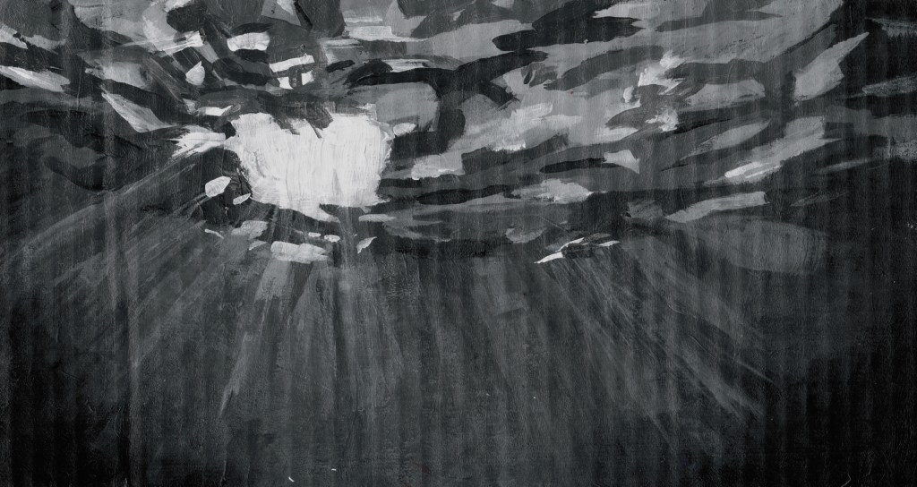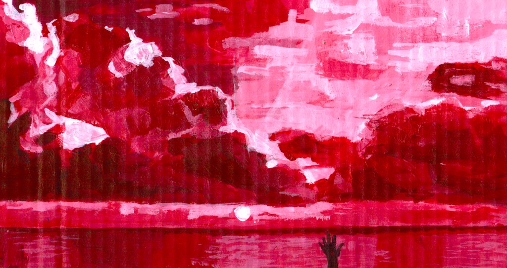 Gray is oppression (beneath the water), Blue is a statement (rising from the water), Orange is an interpretation (standing in the water) and Pink is a change (looking past the water at the sky). The final painting shows what the first, Gray, could never do: have color, and touch the light.